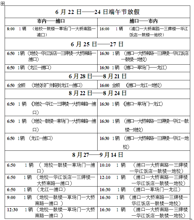 2012年6月22日——9月28日班车时刻表