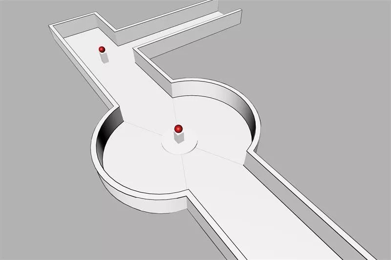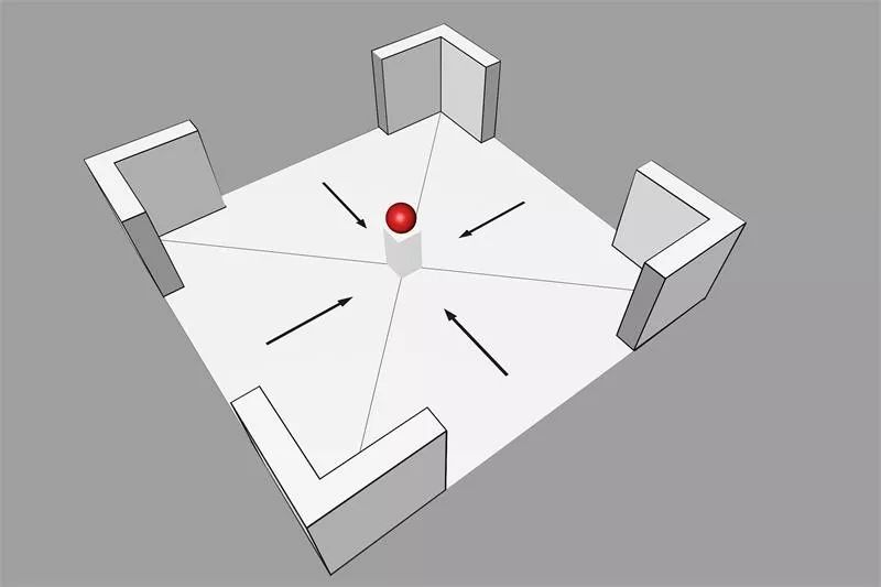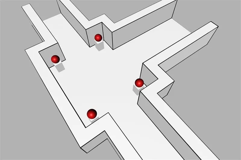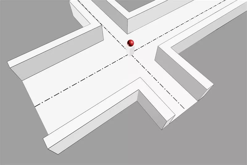 平面中轴线的交会处,是指两个或两个以上平面的中轴线交会处,因为人的视线会将停留,如在此处布置陈设品既起到构建景点的作用,又能强化空间的转换关系,如图3.2.4 布置在平面轴线的交会处示意,又如图3.2.5 花钵布置在两条走道轴线的交汇处。