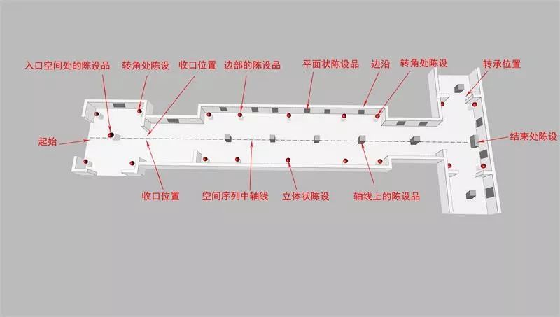 在此处布置陈设品通常会起到完善空间视觉效果的作用。如图 3.2.37 a 为卢浮宫雕塑展厅中用体量硕大的胜利女神雕像作为空间结束的布置,图 3.2.38 为展示空间中陈设品布置的常规序列,入口、转角、轴线、边沿、结束等处均应布置雕塑或图片等。