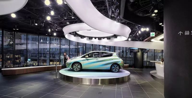 1)奇特或新颖的陈设品容易感知,如图 3.1.1 a 曲面的、流动的顶棚造型与汽车展台上下对应,其形态引人注目。