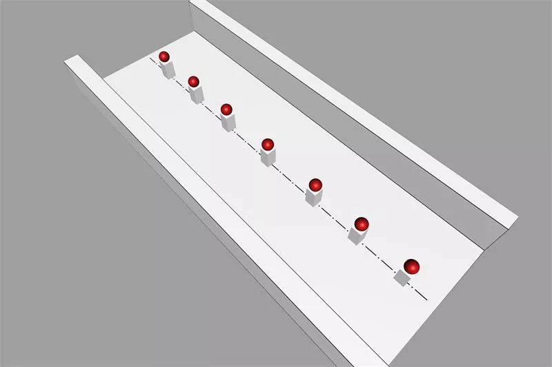 将陈设品有序地布置在单个平面或组合平面的中轴线上,会起到强化空间序列和强化空间整体感的作用,如图 3.2.8 布置在平面的中轴线上示意,又如图 3.2.9 a 广场中连续排列的岛式柜台。