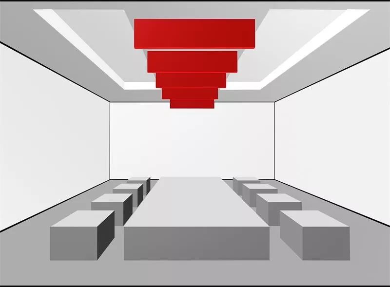当陈设品布置在狭长空间的端头时,减少两侧界面和顶棚、地面的装饰,减弱其照度,并加强灯光对陈设品的照度,从而迫使人们的观赏视线通过空间轮廓的透视消失线集中到陈设品上。如图 3.1.15 a 为了突出廊道中的雕塑而将灯光照明集中在雕塑上。