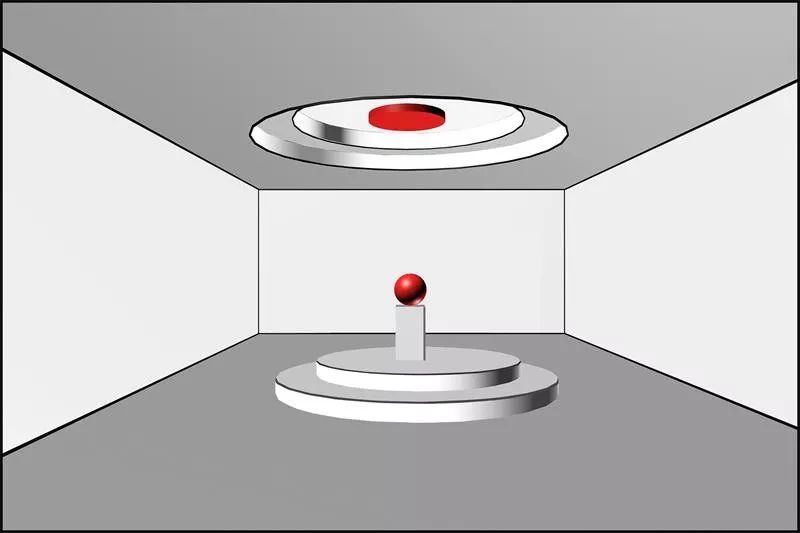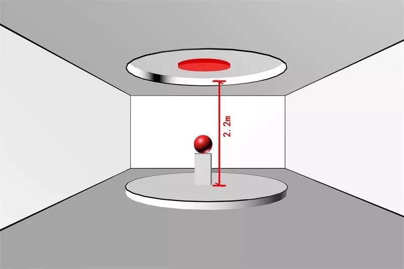 布置在规则平面的中心,因此处通常会成为视线的汇聚处,如将陈设品布置在此处,既能吸引视线,又能起到重点构景的作用。倘若在此处布置具有较大体量或新颖形态的陈设品,必然会成为整个空间主要的视觉中心,如图3.2.6 布置在规则平面的中心示意,又如图 3.2.7 a 大堂中的环状装置。