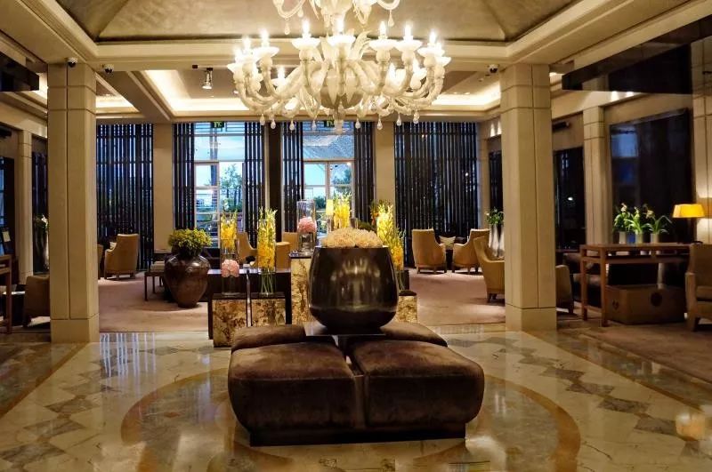 视知觉具有直觉性,视觉扫描有一定的秩序,一般为先正面→后两侧,先近处→后远处,先视平线位置→后上、下位置。可以说人在室内驻足时的视点方向决定了视觉扫描的秩序。譬如当人正面进入酒店大厅时首先感知的是大厅中部的物象,随后感知的是大厅正对面的物象以及两侧的物象,最后感知的是顶棚或地面上的物象。其感知的秩序如图 3.1.8 所示(详图见《室内陈设设计教程》):正面前部的物象→正面的物象→两侧的物象→顶棚或地面的物象。因此在室内陈设布置中,陈设品的视觉感知程度一般应按视觉的先后秩序设计。尤其是对于在空间中首先正对人们视线的陈设品,要注意其视觉效果和艺术品位,以使得室内视觉环境给人良好的、深刻的第一印象。如图 3.1.9 酒店大堂的正中布置了靓丽的鲜花,顶棚悬挂了古典样式的灯具。酒店大厅两侧的陈设品,其色彩和形态上都比较传统,较好地适应了人们在空间中的视觉感知的规律。