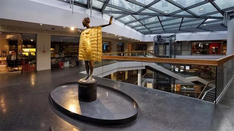 物体在光的照射下才能显示出形体和色彩。为了突出这些陈设品的视觉效果,可以适当加强灯光的照度和显色度,以强化陈设品形态的感知度。在恰当的灯光作用下,陈设品能充分展示色彩饱和度、形体及肌理的特征,从而突出了其在环境中的视觉感知。如图 3.1.19 商场门厅中用灯光、灯具强调的雕塑的感知度。