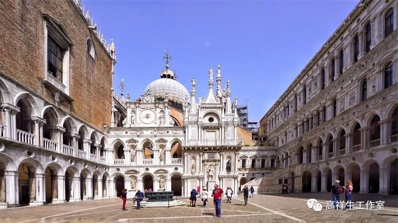 圣马可小广场由相向而立的总督府西立面和图书馆东立面围合而成。威尼斯总督府,教科书称其为拜占庭风格,虽然它与圣马可教堂毗邻但是两者的建筑风格截然不同。教科书上都把总督府立面的造型作为拜占庭的典范向读者和学生介绍,由清华大学陈志华先生著的《外国建筑史(19世纪末叶以前)(第三版)》中如此描写到“威尼斯总督府是欧洲中世纪最美丽的建筑之一。总督府曾经几度改建,原来是一座拜占庭式的建筑,……它的平面是四合院式的……总督府的主要特色在南立面和西立面的构图。……这墙面的处理显然受到伊斯兰建筑的影响。……这两个立面的构图极富有独创性,奇光异彩,世界建筑史中几乎没有可以类比的例子。……”从这段文字中可以得到几个结论:总督府的原貌是拜占庭式样的,中途改造过,可见拜占庭样式就不会太纯正。我认为陈先生对南立面和西立面的描写是细致精确的,陈先生详尽的介绍了总督府外立面特别是南立面和西立面是拜占庭风格的典范,但是陈先生既然提到了总督府是四合院式的,但我没看到对内庭的描写,我所见到的内庭主面上以及室内空间大多是古典风格,依稀可以见到巴洛克风格在建筑上的体现。为何内庭的风格跟外立面截然不同,是原有的还是加建的,其缘由我不得而知。