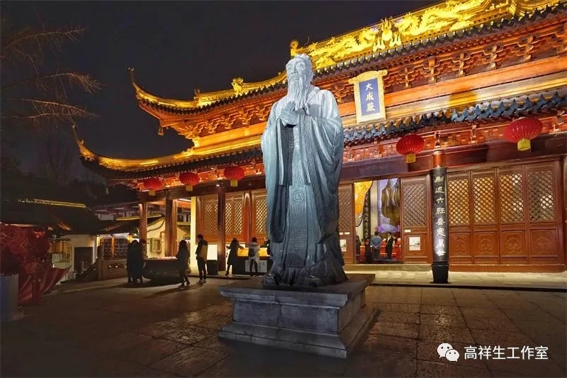 端庄、谦和的孔夫子两手作揖的雕像和庄严的大成殿 高祥生摄影