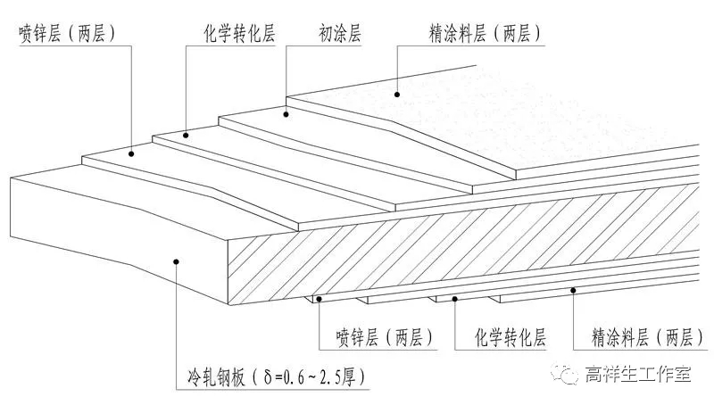 铝 塑 板 由 三 层 组 成, 其 表 层 和 底 层 为2 ~ 5 mm 厚高强度铝合金薄板;中间层为聚乙烯芯材(或其他材料的夹心层),经高温高压制成的新型装饰板,表面喷涂氟碳树脂或聚酯涂料(图 6-3-5)。