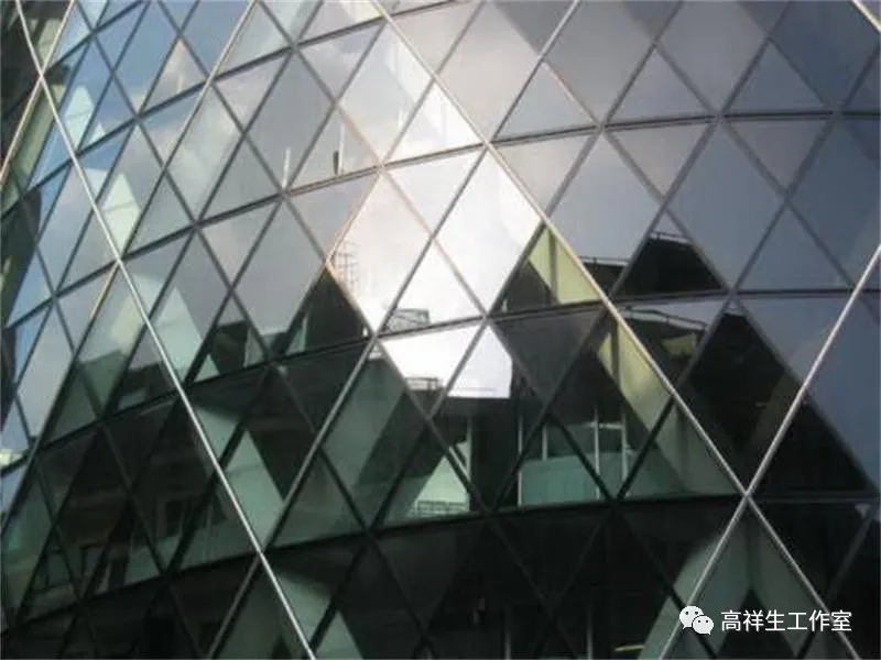 热反射玻璃是在平板玻璃的表面用物理或化学方法涂覆一层金属或金属薄膜而制成的玻璃。其表面膜层对阳光有较高的反射能力,反射率在30% ~ 60%,并能使玻璃具有良好的隔热性能。热反射玻璃的迎光面具有镜子的镜像反射性能,而其背面又有透视性,因此具有良好的单向透视性(图 4-2-11)。