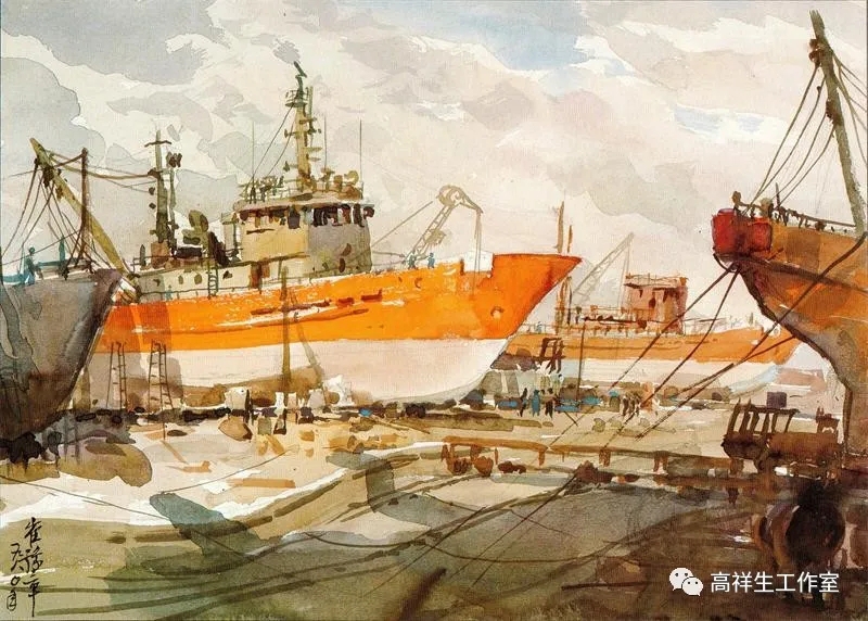 我认为这是崔老师水彩写生绘画中的杰作,其控制画面整体效果的能力,在国内外水彩画家中少有画家能达到。特别是三组船只,虚实、疏密的处理,极为精妙,成堆的船只参差排列,寥寥数笔跃然入纸,竖向笔触又勾勒出三组船只的神韵特征,此时段的崔老师在水彩绘画上已达到出神入化、登峰造极的地步(图 11)。
