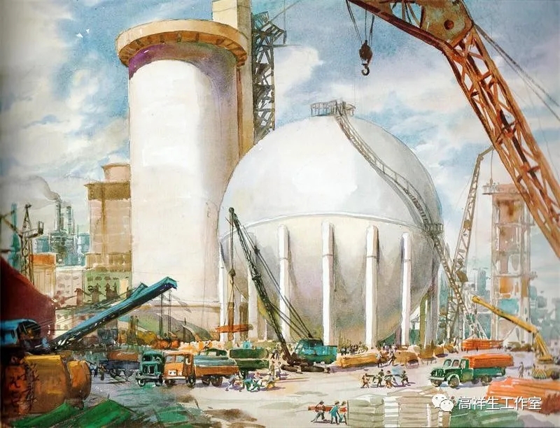 表现圆形、圆柱形的物体需要对圆形、圆柱形在光线作用下呈现的体积状态有充分的了解。用水彩画表现圆形、圆柱形还需要有娴熟的水彩画技能,作到一气呵成。在水彩画表现圆形、圆柱形的体积逐变中,既不能出现忽明忽暗的部位,也不能像油画、丙烯画、铅笔画、木炭画来回修改,或多次覆盖。崔老师用水彩画表现的南京炼油厂工地既要突出油罐,又要同时反映繁忙工地上的吊车、车辆、人物等,因此要把握好画中的主次、虚实,前后层次关系有很大难度。但崔老师能将庞大的场面、复杂物体按照画面场景的效果,将各种物体按照整体效果各就各位地妥妥当当摆放好,这需要高超的艺术修养,具备一般画家无法达到的技术水平(图 1)。