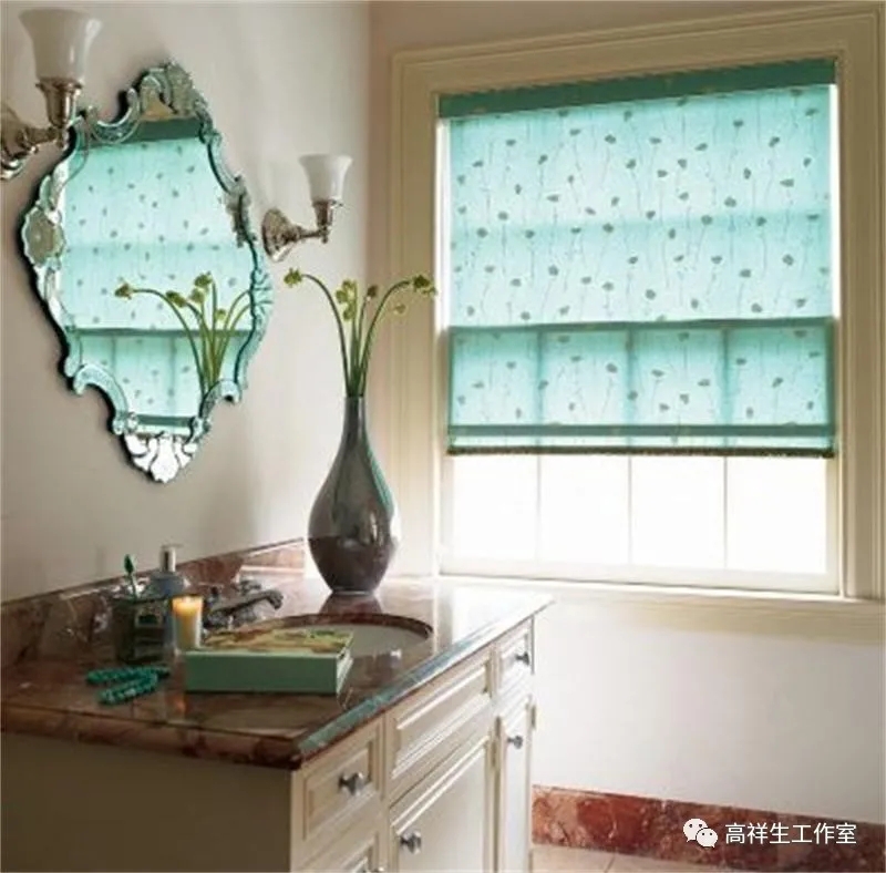 这种窗帘遮蔽功能较强,开闭自如,占用空间小。根据需要可用不透明的窗帘,也可用半透明或印有花纹的织物帘布,还有的使用人造革等非织物帘布。一般用于有特殊开间需要的空间或较小的房间(图 10-1-18)。