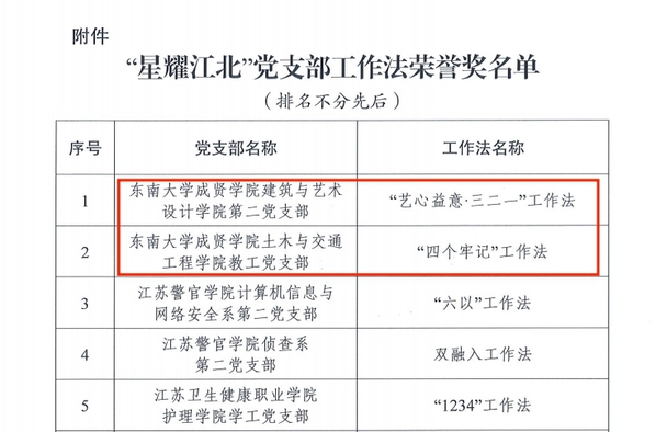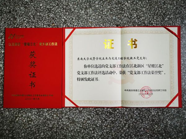 为深化党建强基系列行动,真正把党建基因融入江北新区发展血脉,进一步发挥基层党组织战斗堡垒作用和党员先锋模范作用,我校推选的pg游戏电子模拟器第二党支部“艺心益意·三二一”工作法和土木与交通工程学院教工党支部“四个牢记”工作法在江北新区此次“星耀江北”党支部工作法评选活动中双双获奖。