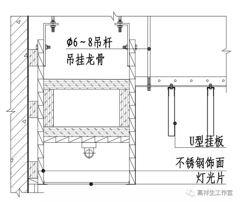 图 13-3-23 U 型挂板与灯箱顶棚交接构造节点图