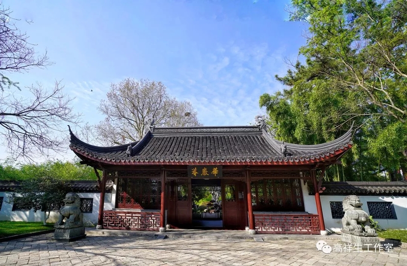 进入莫愁湖公园后绕过月牙池,有小径连通华严庵。现在的华严庵主要有门面和庭院。华严庵的门面为三开间,端庄,大方,左右设石狮两尊,威严、静穆,屋面青瓦铺贴,飞檐起翘。我曾多次带学生在华严庵内作建筑写生,至今印象深刻。华严庵内卵石铺地,花纹精美,庵内中央耸立一块硕大的湖石,玲珑剔透、气宇轩昂,足以与苏州留园的湖石“冠云峰”比美。华严庵庵内绿荫环抱,庵内西侧廊道通彻,廊柱成排,西侧有门洞通往莫愁女故居,东侧有入口可达棋文馆。