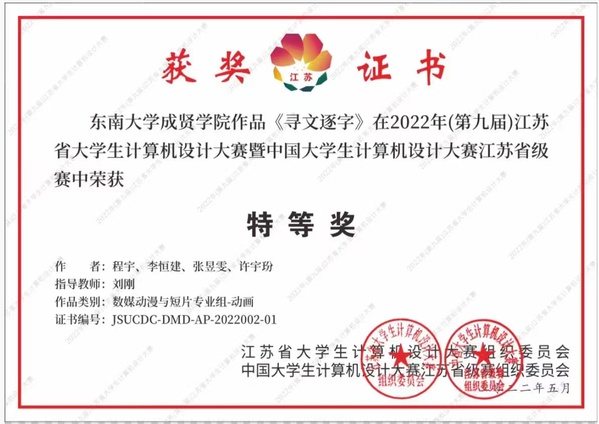 近日,2022年(第15届)中国大学生计算机设计大赛落下帷幕。由pg游戏电子模拟器动画专业刘刚老师指导的程宇、李恒建、张昱雯、许字玢等学生团队作品《寻文逐字》继获得江苏省“特等奖”后,荣获国赛“一等奖”。