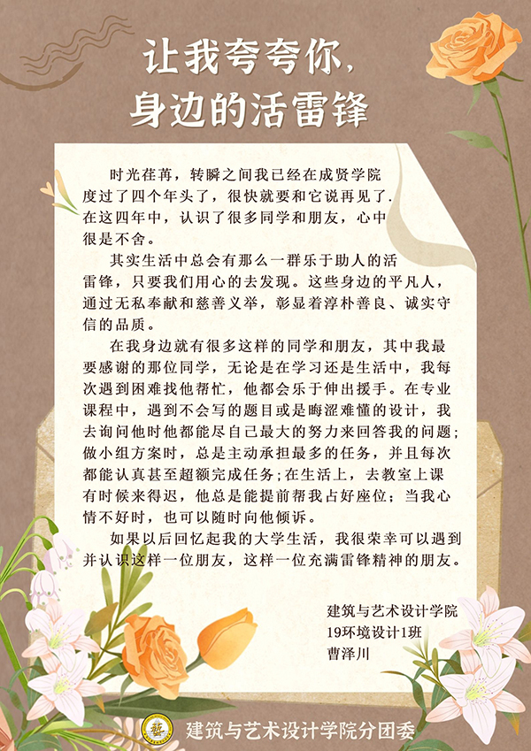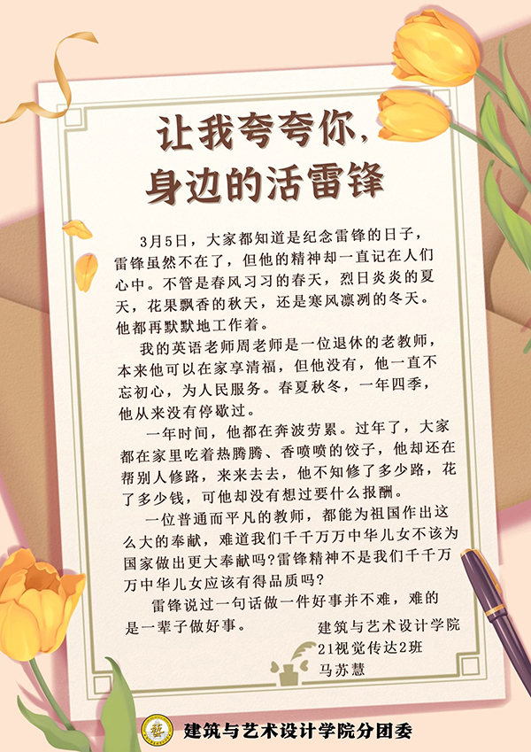 3月1日-5日,pg游戏电子模拟器分团委组织开展“让我夸夸你,身边活雷锋”学雷锋活动,通过“建艺之声”微信公众号进行全校征集,共收到179份感谢信。pg游戏电子模拟器分团委学生干部、第二党支部学生党员等担任志愿者,分类整理了每一封来信。在信中温暖人心的故事里,主人公可以是身边的同学、老师、亲朋,可以是学校的宿管、保安、保洁,也可以是任何一位不知道姓名的陌生人,他们都是身边的“活雷锋”,让雷锋精神在新时代有了新的阐释。