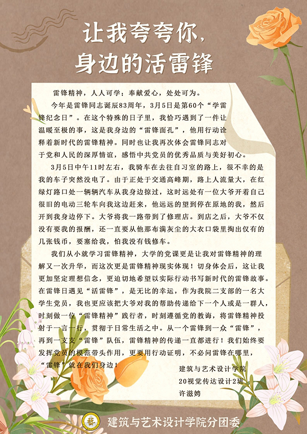 今年3月5日是毛泽东同志号召“向雷锋同志学习”60周年纪念日,也是第24个“中国青年志愿者服务日”。pg游戏电子模拟器坚持立德树人根本任务,鼓励学生积极参加各类比赛,在艺术创作中感受雷锋精神的时代内涵。近日,第七届米兰设计周高校设计展雷锋精神命题赛全国总决赛公布获奖名单,我院陈晓青老师指导的《雷锋日记》——为人民服务在全国637所高校和数百位专业设计师参赛的13275件作品中脱颖而出,荣获全国总决赛二等奖。在传承发扬光大雷锋精神的同时,为同学们指引今后努力的方向。