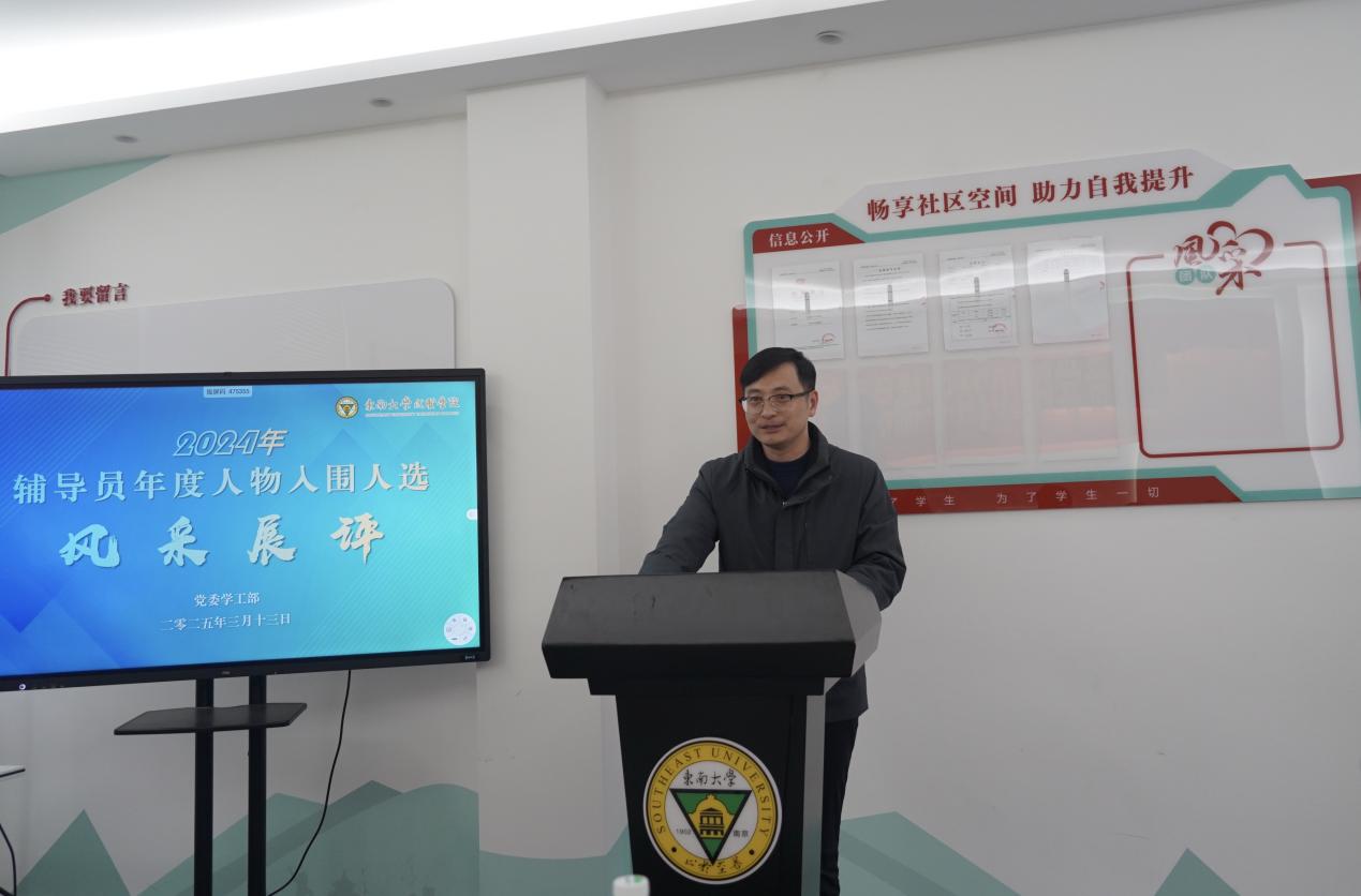 本次辅导员年度人物评选分为事迹材料考评、学情测试、风采展评、同行互评四个部分。3月10日,党委学工部在真知馆305会议室进行了学情测试,考察辅导员对学生的了解与熟悉程度。3月13日下午,党委学工部在“一站式”学生社区组织开展辅导员年度人物评选风采展评活动。校党委副书记、副院长王荣出席本次活动并致辞,南京邮电大学电子与光学工程学院、柔性电子(未来技术)学院党委副书记、副院长徐磊,东南大学材料科学与工程学院团委书记、东南大学2023年及2024年辅导员年度人物韩林原,校组织人事部部长汪旭东,党委学工部部长、学生处处长施杰,团委书记、人武部部长潘明烽应邀担任活动评委。各学院辅导员代表作为同行互评人员参加本次活动,活动由学生处副处长沈黎芳主持。